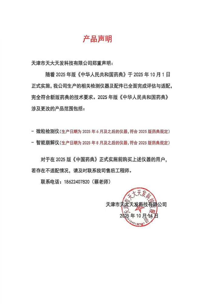 聲 明鑒于2025版《中國藥典》的更新,為保障天大天發(fā)忠實用戶的切身利益,凡在2025年之前購置我公司設(shè)備的客戶,若您的設(shè)備未能滿足新版藥典的要求,我們將提供升級服務(wù)。涉及產(chǎn)品:微粒檢測儀:GWJ-1···...